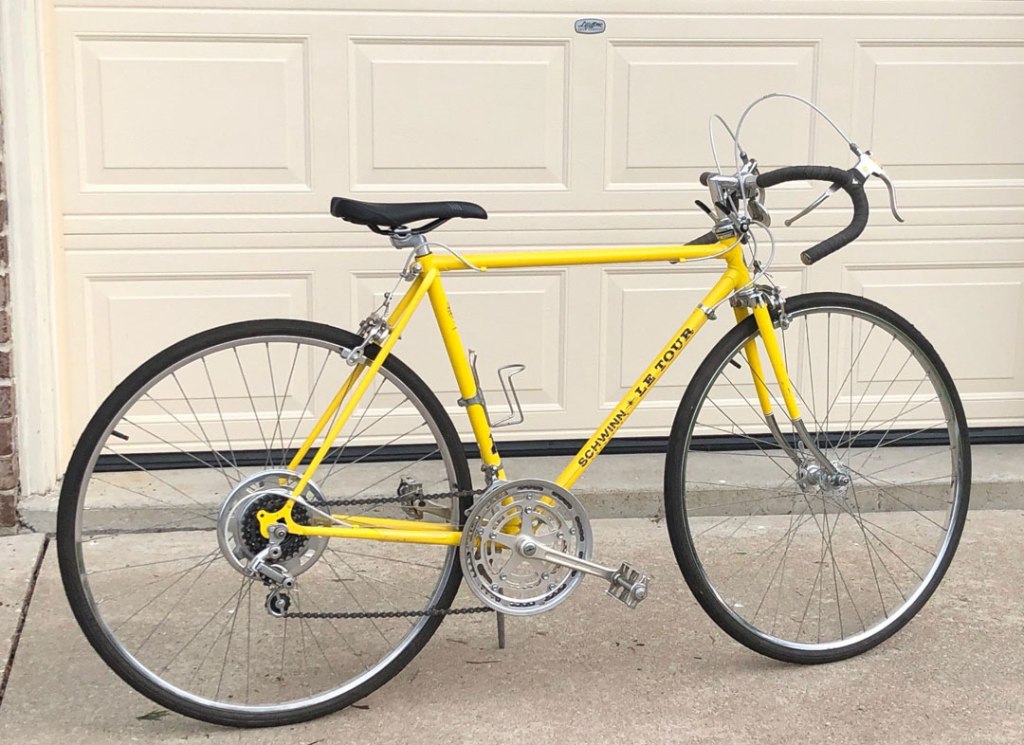 Mine must weigh around the 30lb mark as it is the smallest size with a 21” frame. The standover height is right about 31”. It has 10 speeds with a double in the front and 5 gears in the back. I will probably get some new, more black tape for the bars and maybe get an original Schwinn seat for it. Other than that, I will ride it and enjoy looking at it.