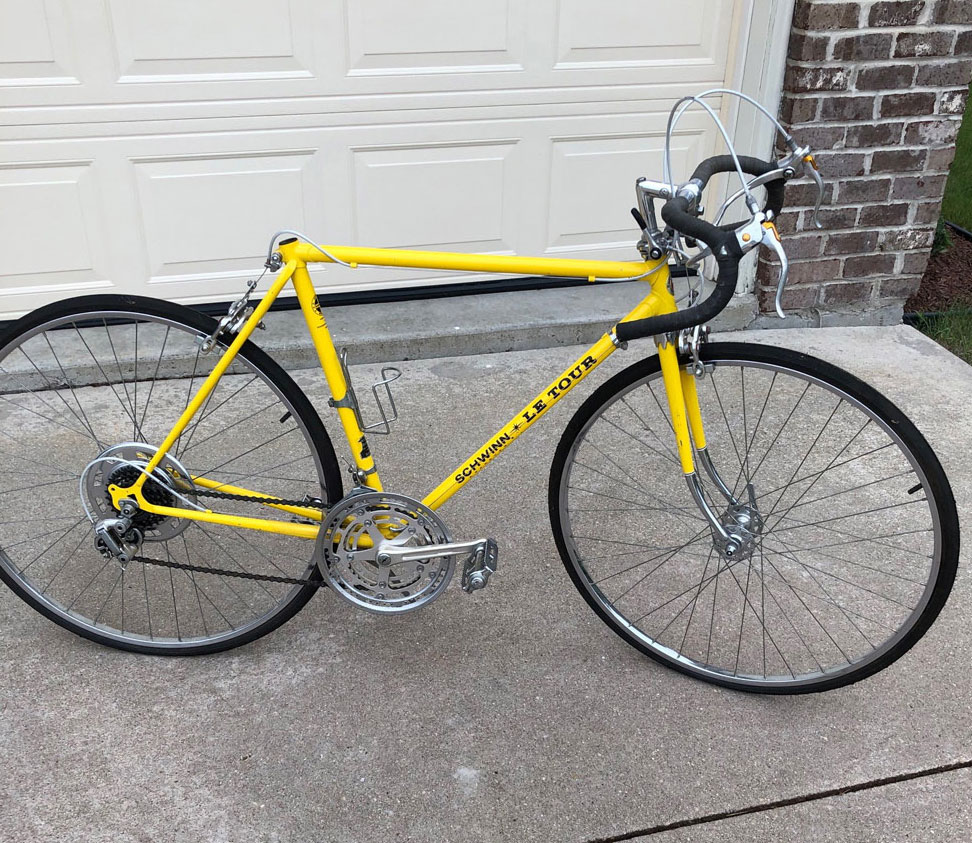 I saw this bike and just had to buy it. This is my 1974 Schwinn Le Tour painted in kool lemon. A cool yellow Schwinn bike made in Japan with a French name. Here it is just after I brought it home:
