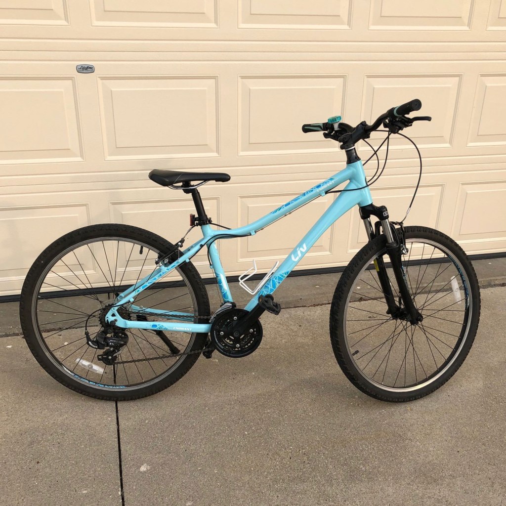 Here is another nice bike from the fleet, my daughter’s 2017 Liv Enchant woman’s bicycle in a nice blue color. Bought this one used and tuned it up, and it’s been a great bike. She previously had a 24” mountain bike and says she likes the more upright riding position of this bike better. Have a look at it: