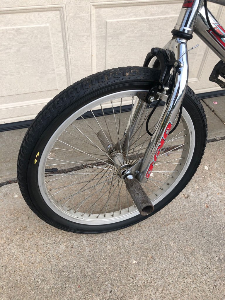 Chromoly frame is all chrome.  20” wheels have alloy hubs and rims.  Pegs are on the front and rear wheels for doing cool bmx stuff.  This thing freewheels and has hand brakes.  I always had the coaster brakes.  Way better than anything I ever had, oh and it’s got the fancy gyro stem so you can spin the bars around while doing your rad tricks.  A really sweet ride.