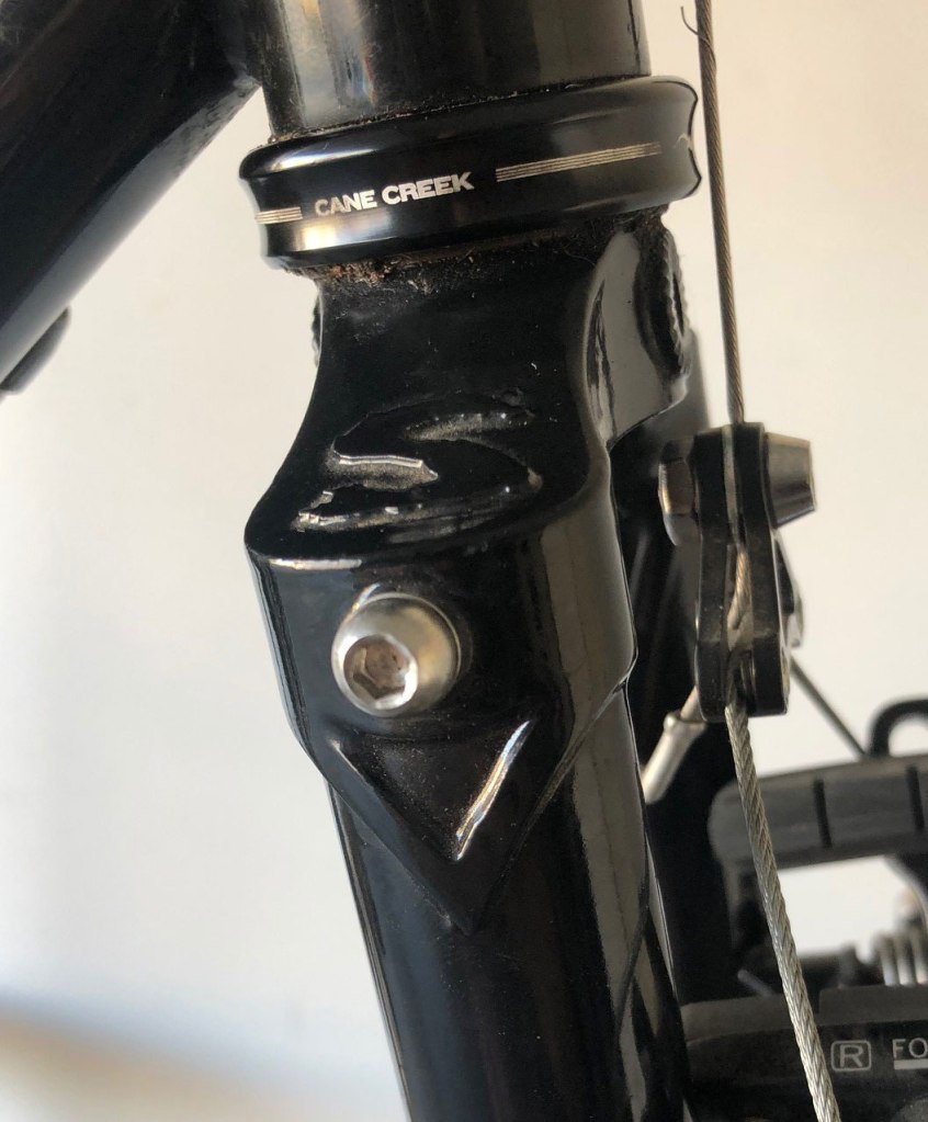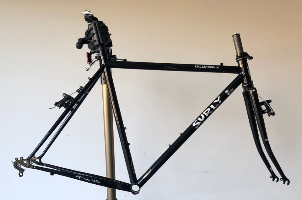 It’s about the same size as my 74 Schwinn Le Tour so I think it should be a good fit. Made from 4130 CroMoly steel. Fork is lugged and brazed 4130. I think it is just a little lighter than my old Schwinn frames. I bought this frame used on Ebay and it came with the brakes, housing stops with barrel adjusters, headset, and seatpost. It only had one not so good picture but was described as lightly used. Since it was cheaper than any other Surly frame I had seen, I jumped at it. I probably should have asked for more pictures. This frame has a highly visible scratch, chip, or damaged decal on every tube. Who the heck calls that lightly used? It should look good with some touchup work and a few new decals, but it’s gonna take some time. Structurally the frame and fork seem fine.