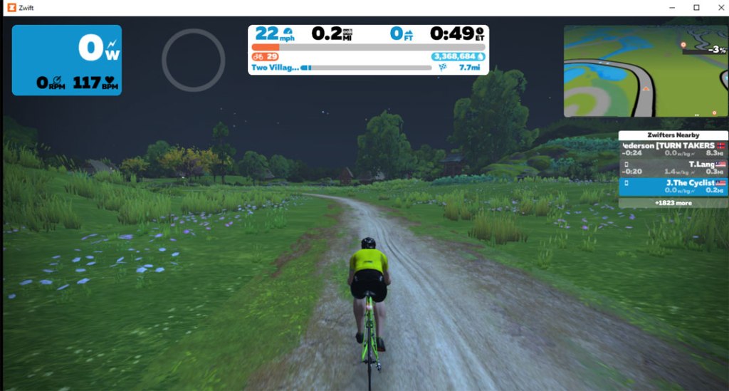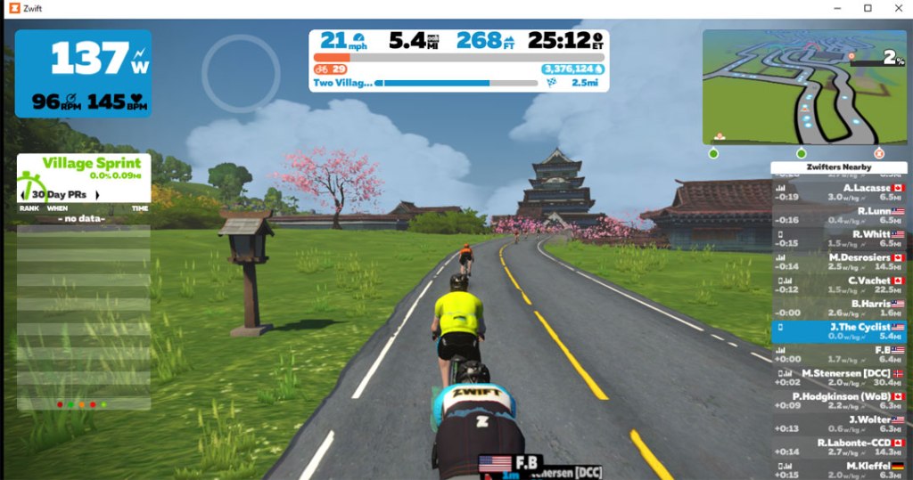 This course is a nice mix of pavement and gravel with a decent amount of elevation. It is about 8 miles long with 300 feet of elevation and I guess roughly half gravel and half pavement. I use a gravel bike on this one. It goes through the countryside and through two villages on the Makuri Islands world. This world is inspired by Japanese culture, so it has lots of interesting things to view. Check out these images: