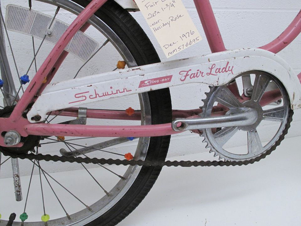Here is the girl’s version of the Schwinn Sting-Ray, the Fair Lady. The color is holiday rose, and it also has a nice flower banana seat. Wheels are 20” with a coaster brake. Fenders match the steel step through style frame. Same Sting-Ray style bars as the boys bike.
