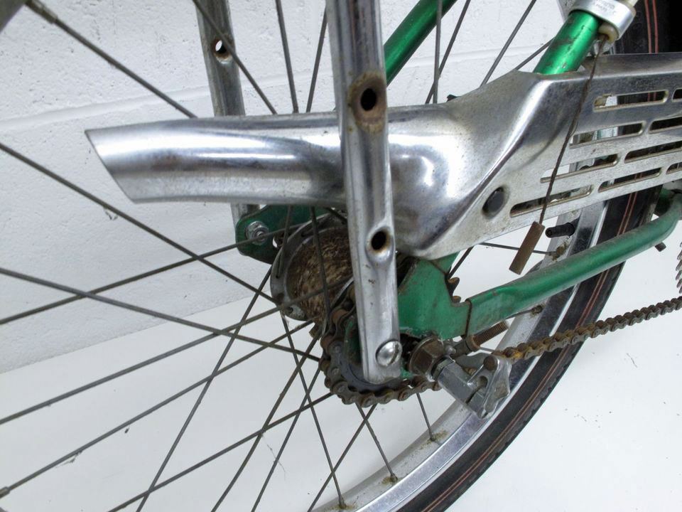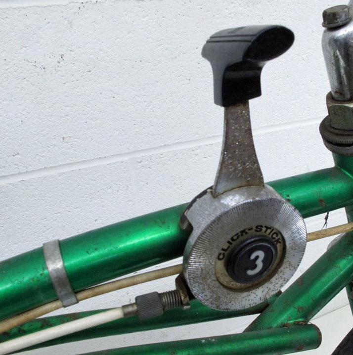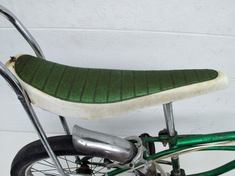 I don’t normally like a Huffy, but this is a really neat bike. First, it’s a 3 speed stick shift on the top bar which is cool. Next, it’s got the tall bars with the banana seat, the Sting-Ray look. The seat is a two-tone green metal flake color. This is a kids bike with 20” wheels. It also has rim brakes rather than coaster and a chrome rear fender. And look at that chain guard with the exhaust pipe look. Really cool bike for a Huffy!