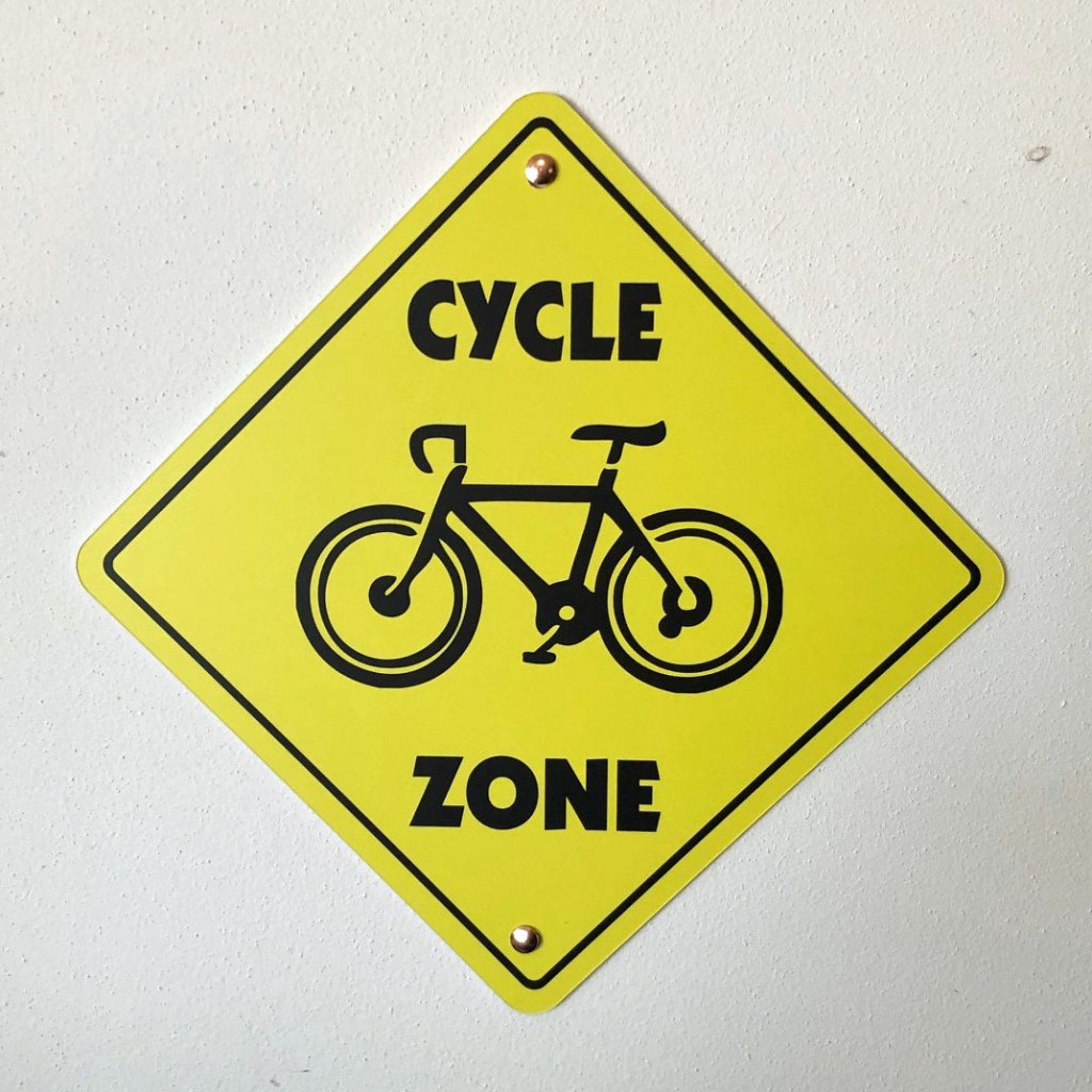 I’m starting to add some bicycle décor around the house and thought I’d share this fun item with you all. It is the 12” Cycle Zone sign. I added it to a wall in the garage where I do most my bicycle wrenching. It’s a nice bright yellow with a picture of a road bike. I went with the 12” tall because I’m hoping to add a number of other signs around it, but they also have 14” and 20” sizes. Check it out: