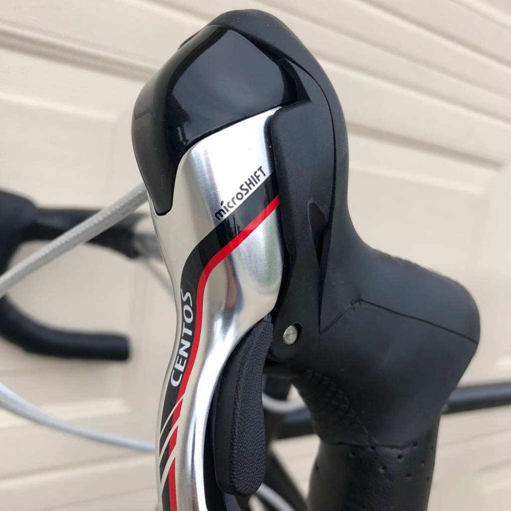 I was looking for a silver groupset that was also affordable for my Surly Cross Check build and landed on the Microshift Centos/R10 group. My shifters are the older Centos 10 speed version, but they are the same as the newer R10 shifters. I’ve been really happy with these shifters. I was worried that I wouldn’t like how they shift, or it would mess up my shifting when I’m on one of my Shimano bikes. So far, no issues switching between bikes, and I may actually like how these shift better. Have a look at these beautiful shifters: