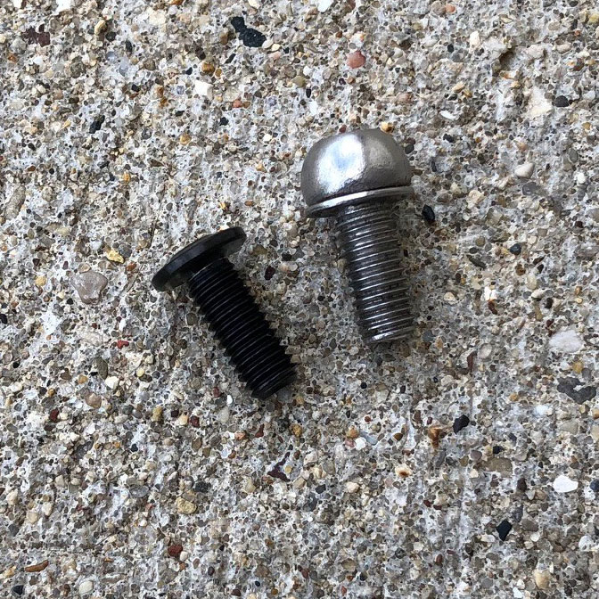 They also have some small, stainless steel cage boss blanking screws.  I decided to go with the titanium bolts, just because I thought they would have a cleaner look.  Here are some images of my regular Surly bolts and comparing to the Terske ones: