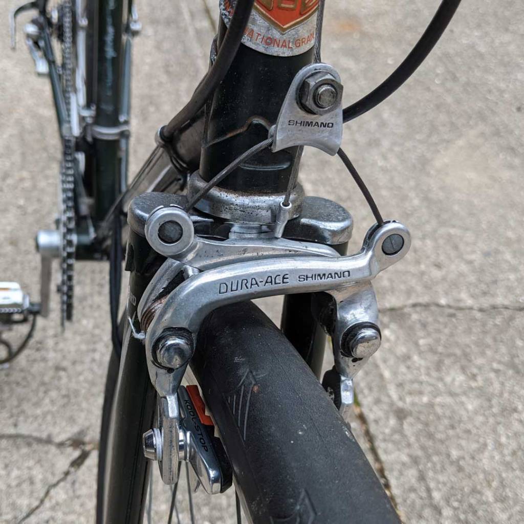 Nice mid-level road bike with lugged steel frame and Shimano Titleist GS rear deralleur, Shimano Dura-Ace brakes, Sugino crankset, Sakae handlebars, and Araya wheels.