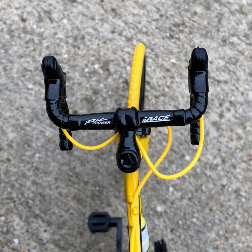 I received one of these neat little models for Christmas and want to share. It is a yellow road bike model with pretty nice details, have a look: