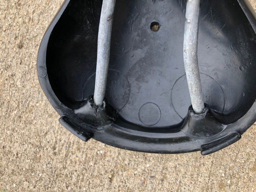 Construction – thick plastic shell(vinyl?) with steel rails.  It does have a bolt for adjusting how much give it has.  The top is very rounded and makes mine pretty stiff, not sure if they had more give when new.  Could be that plastic has hardened up over the years.  Shell has slits for attaching a saddle.